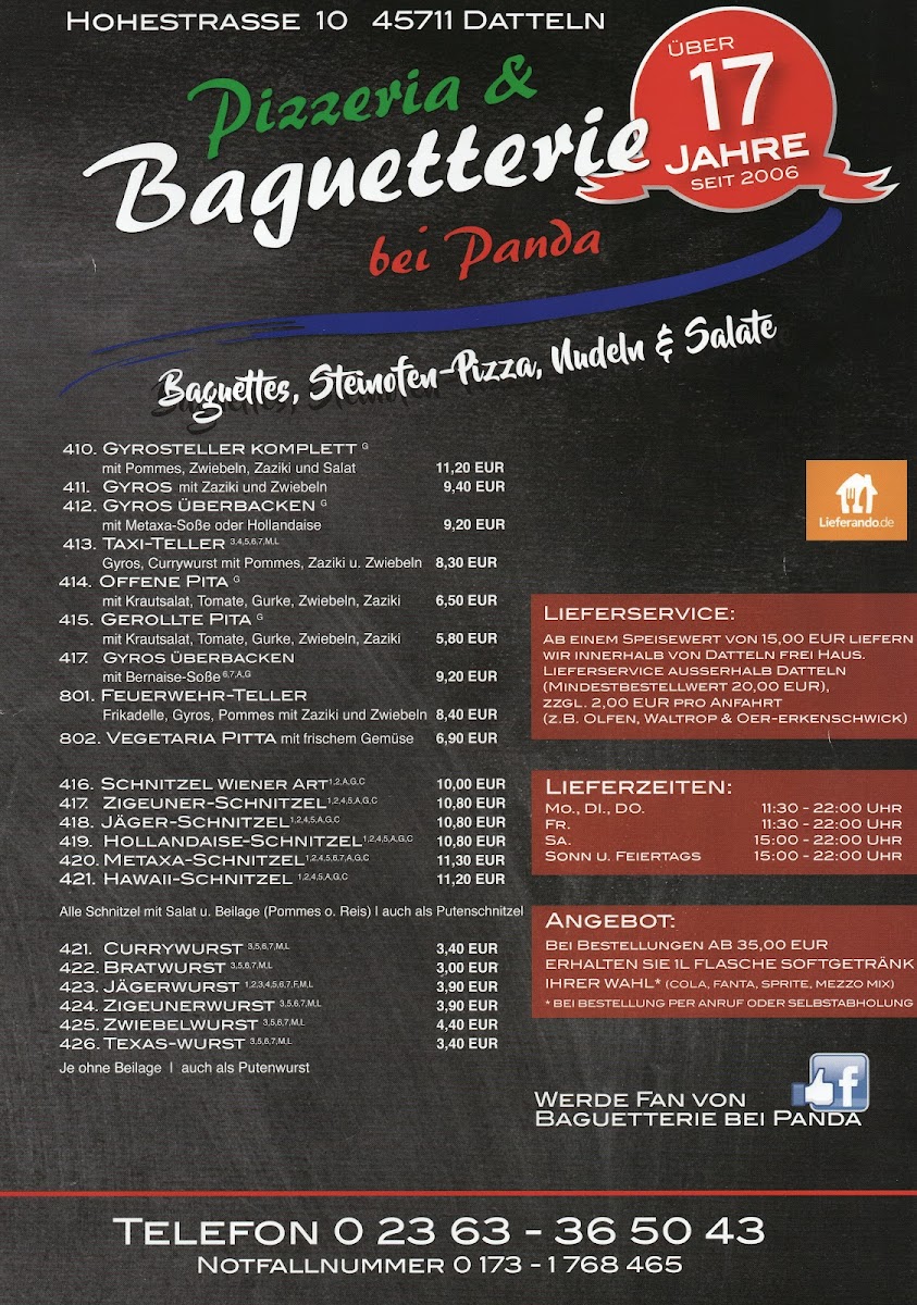 Welcome to Pizzeria & Baguetterie bei Panda, where culinary passion meets exceptional service. Located at Hohe Str. 10, Datteln, this charming pizzeria beckons pizza enthusiasts with its promise of delightful dishes and a cozy ambiance. Customers rave about their experience – from the friendly, attentive staff to the perfectly crafted pizzas with thin, crispy bases that elevate Italian cuisine to new heights.